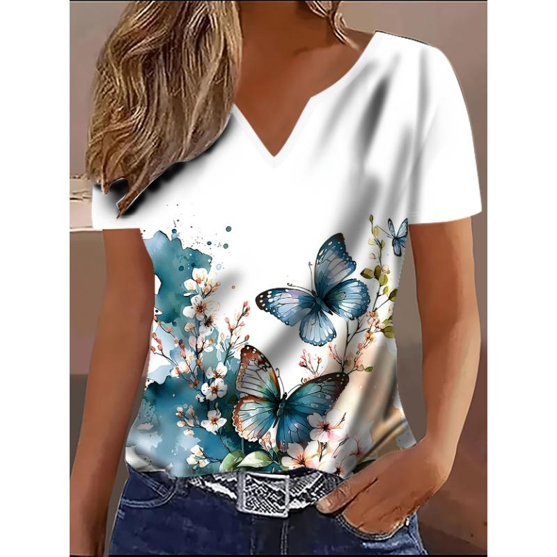 Ladies' Elegant V-neck Short sleeved T-shirt -3D 3D 3D Printed Colorful Butterfly and Flower Design, Breathable Summer Top