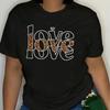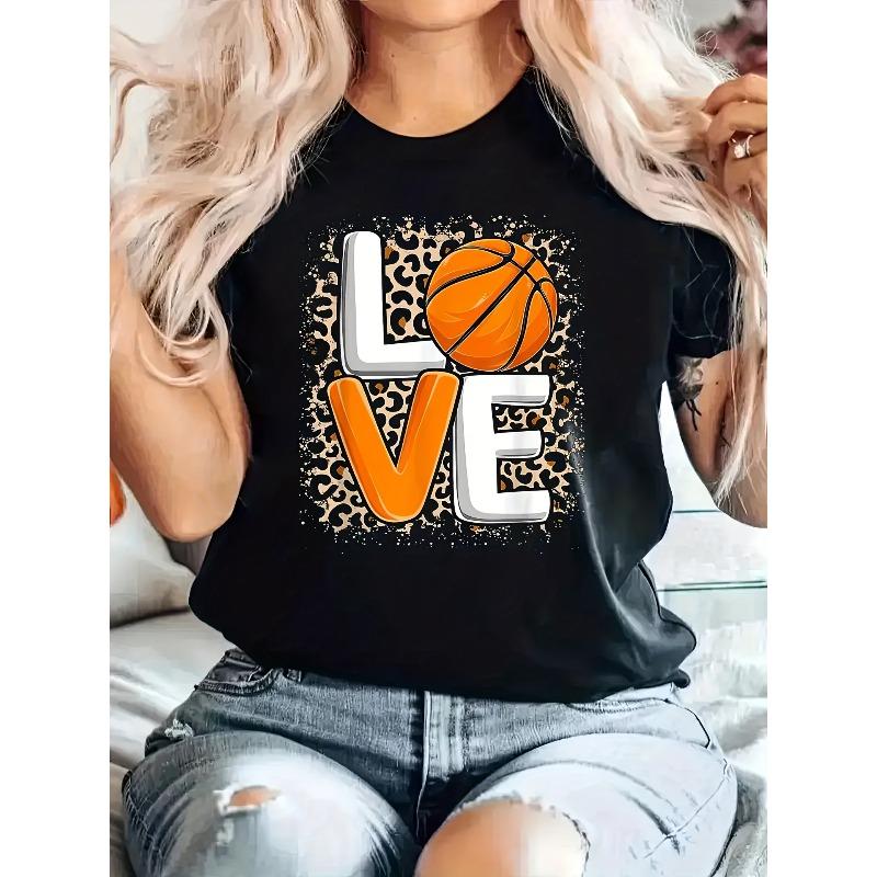 Damen "LOVE" Grafikdruck T-Shirt - Lässiges Rundhals-Kurzarm-Oberteil mit Basketball-Design, Leopardenmuster-Detail, Schwarz