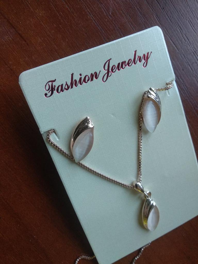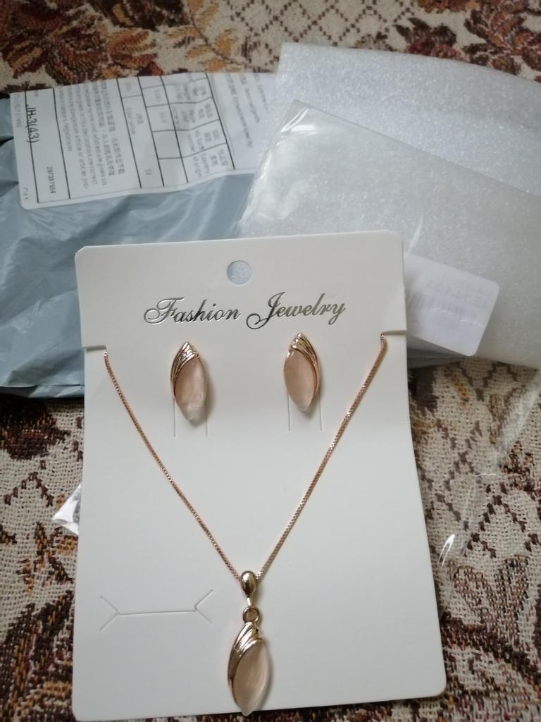 The set corresponds to the description and picture. Received after about three weeks. Neatly packed. Modest and pretty. It doesn't look worse than gold, but I'll see if it turns black. I'm happy.