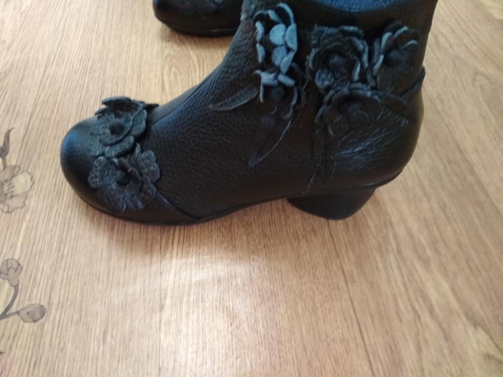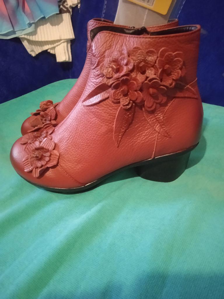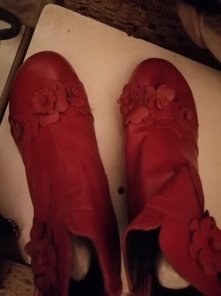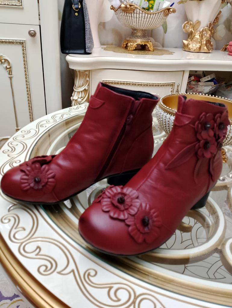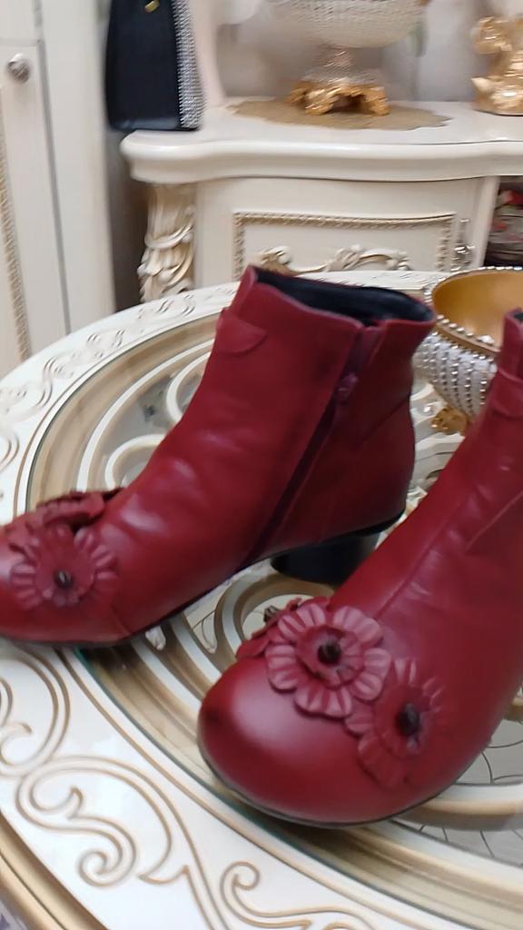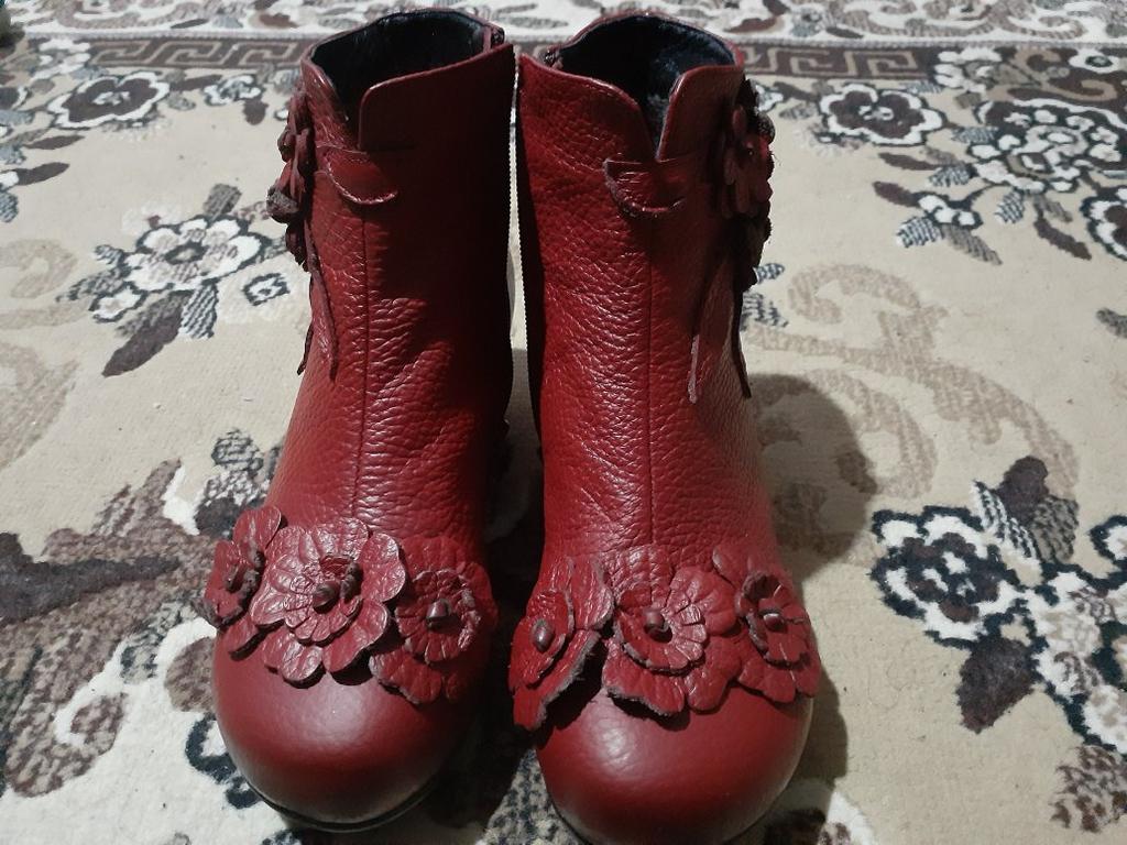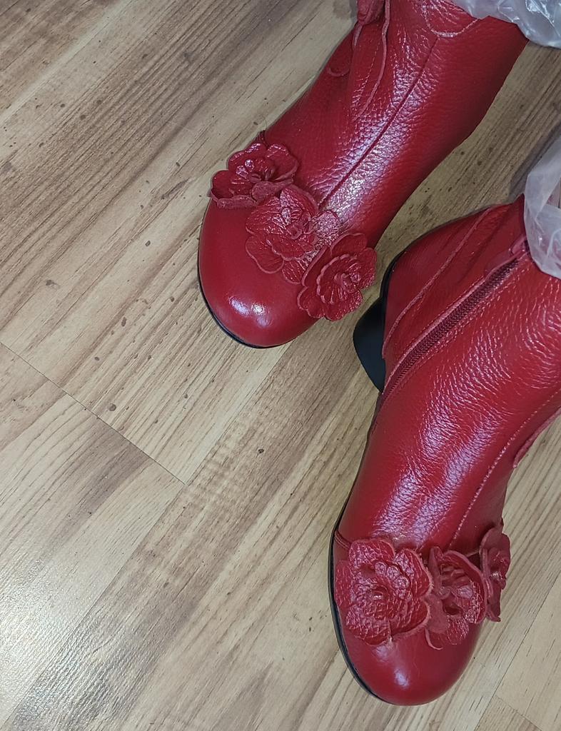 The ankle boots are cute with the rosettes. Unfortunately the color is not bright red, but wine red. The size 38 (I normally wear 37) is tight, but just fits. It would have been better if I had ordered 2 sizes larger so that I could wear warm socks underneath.