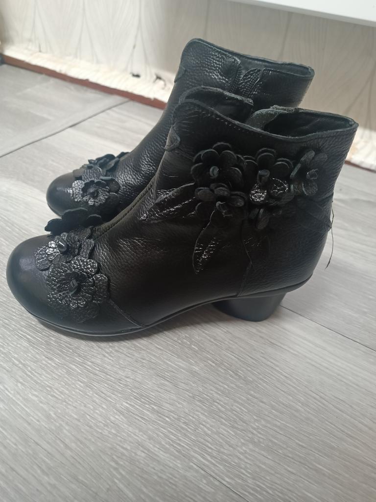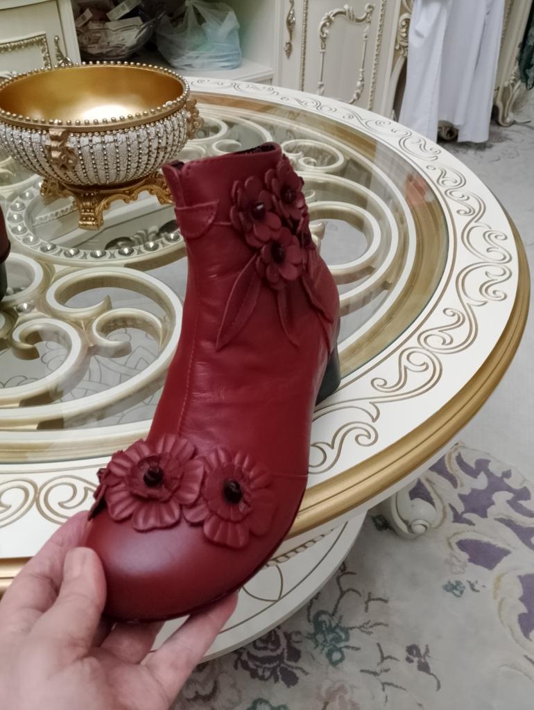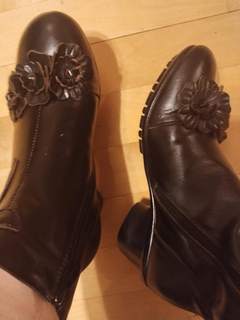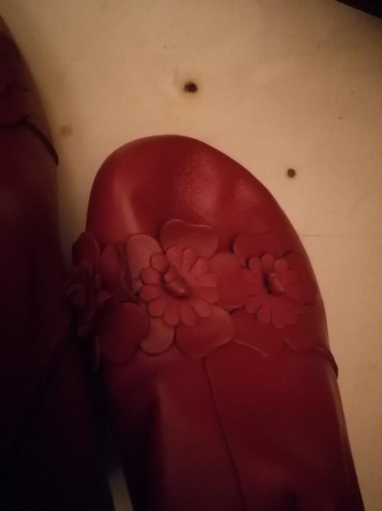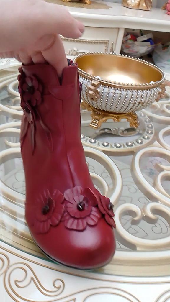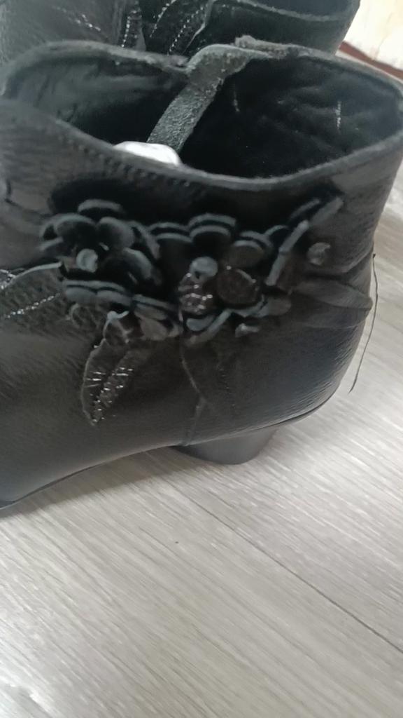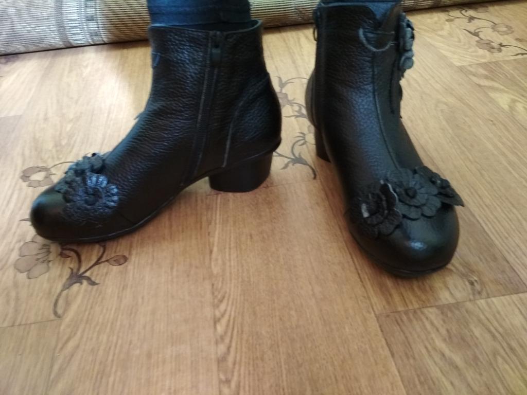 The ankle boots are cute with the rosettes. Unfortunately the color is not bright red, but wine red. The size 38 (I normally wear 37) is tight, but just fits. It would have been better if I had ordered 2 sizes larger so that I could wear warm socks underneath.