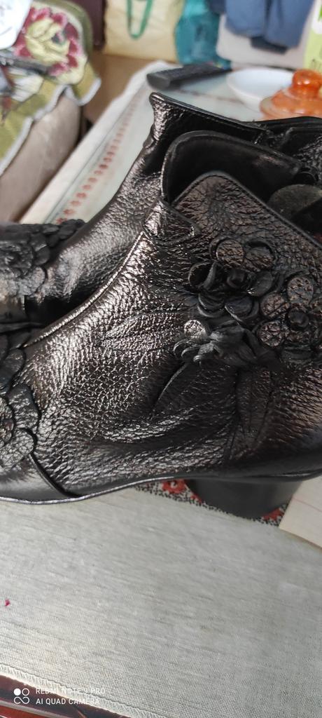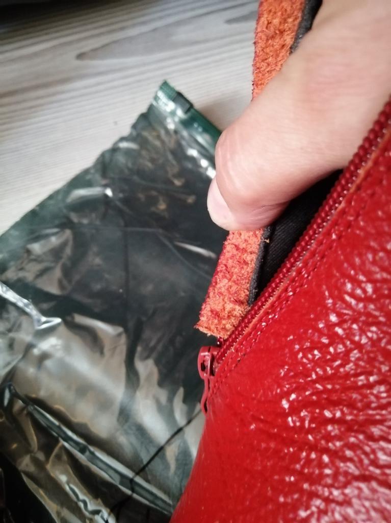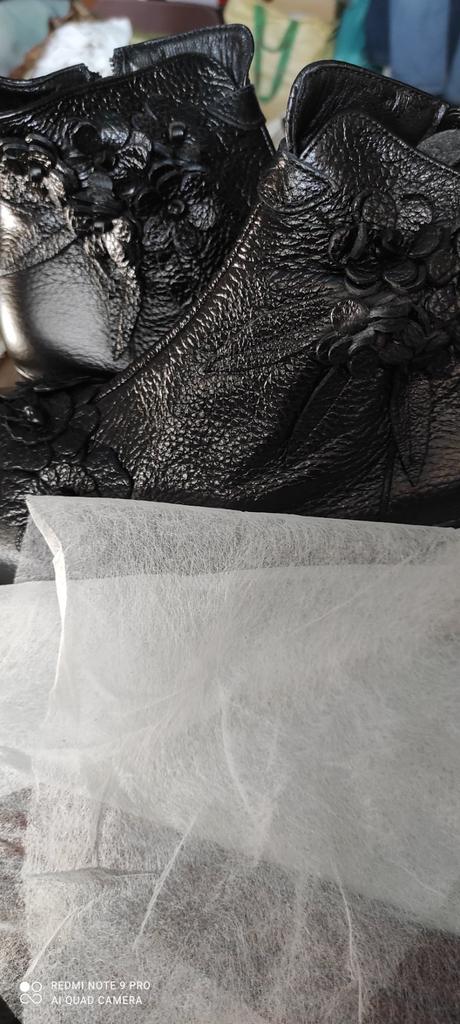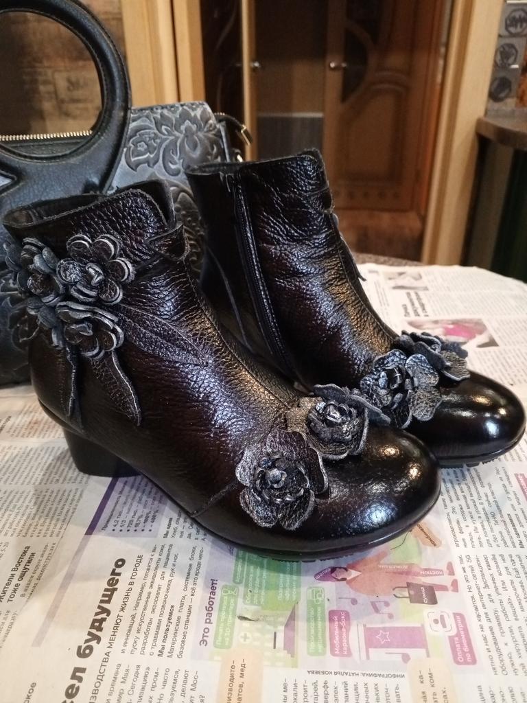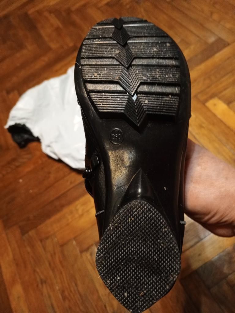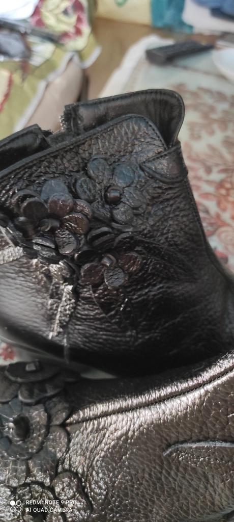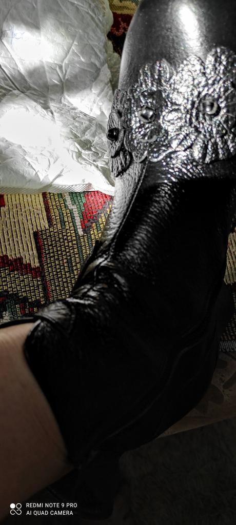 The left boot looks like someone has already worn it. It's all worn out, the decoration is torn off, the placket under the zipper is cut off for some reason.