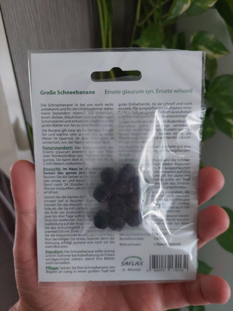 The fast-growing Snow Banana is the strongest specimen of the Ensente family, but by far not as famous as other species. It grows a strong and wax-like, green-blue coloured pseudo-stem that can reach a height of 3 m to 3,50 m, whereas the long leaves of the plant can become 2 m to 2,50 m tall. It grows as rapidly as it can become one meter tall in just about four months. In English-speaking areas the Ensente glaucum is called Snow Banana, and initially it was believed to be as strong as the Musa Basjoo. The seeds come most likely from Yunnan, where it grows in heights of up to 2700 meters above sea level. The Snow Banana resembles the Ensente Ventricosum, with a thick bluey stem, slightly white on the surface - but it grows a bit smaller and develops impressive large leaves. Its dispersal area stretches from Yunnan, Tibet and North East India to Thailand and until New Guinea, while its winter hardiness is quite variable. Therefore, it is imperative to know for cultivation from where the seeds came from. seeds from the high mountain area of Yunnan are definitely the best choice! The Snow Banana doesn’t produce any eatable fruits and you will likely not see any fructification at all. The Ensente species also usually doesn’t develop any layers - only in rare cases it happens spontaneously. If the pseudo-stem freezes off all the way to the ground, the plant will most certainly die. However, a Musa plant is always be preferable to an Ensente species since it is more likely to regenerate after frost and produce new layers.