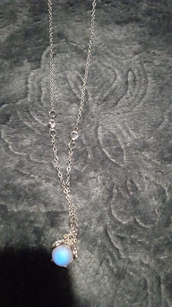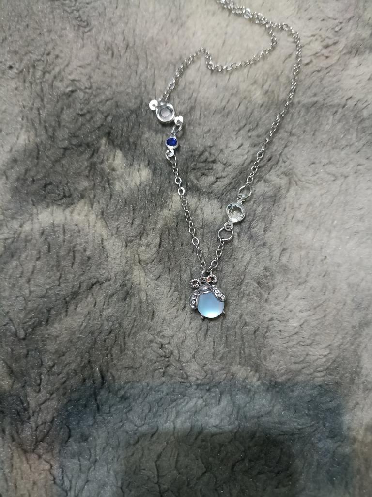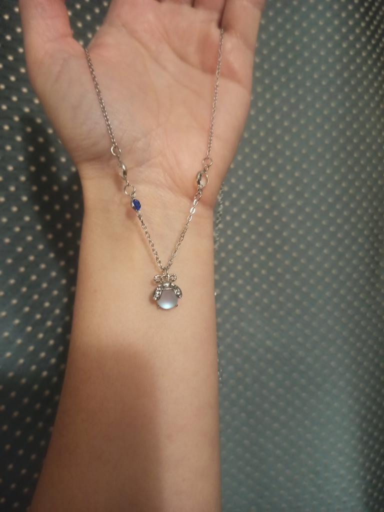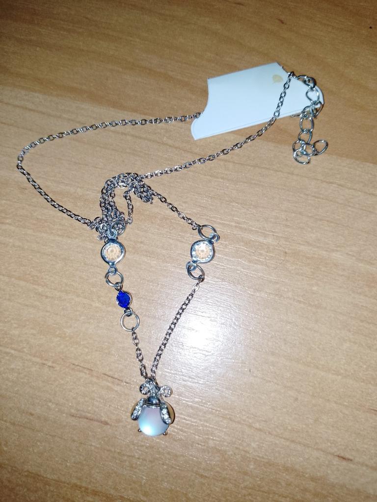 The pendant is very pretty, there is a blue stone on the chain which does not exist in the ad photo, I could have understood if there was one on each side but that is not the case. Impossible to change the chain if you want a longer or shorter one because the stones on the chain block the passage of the pendant.