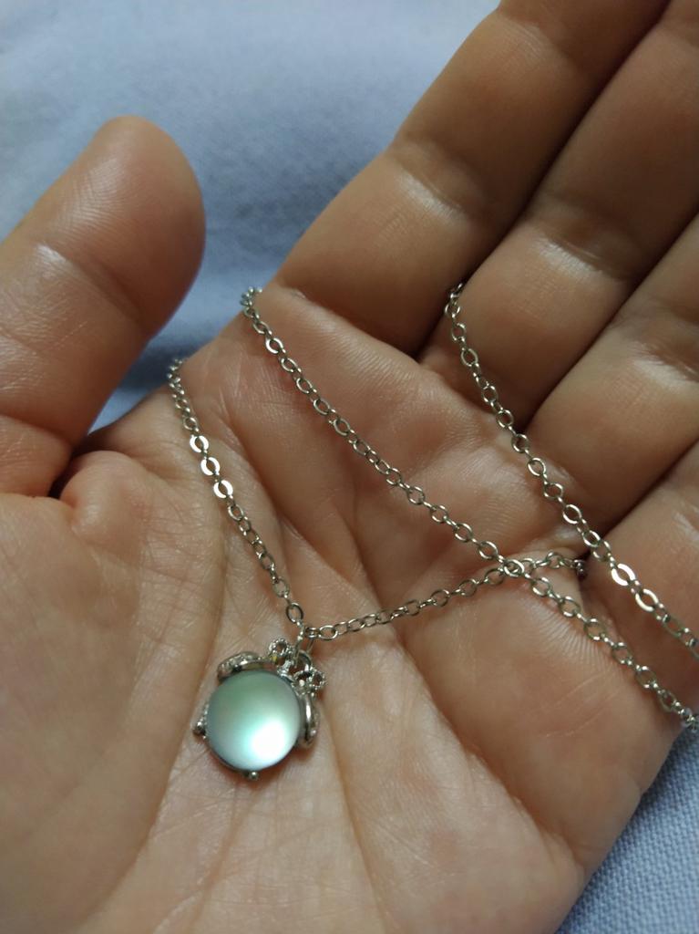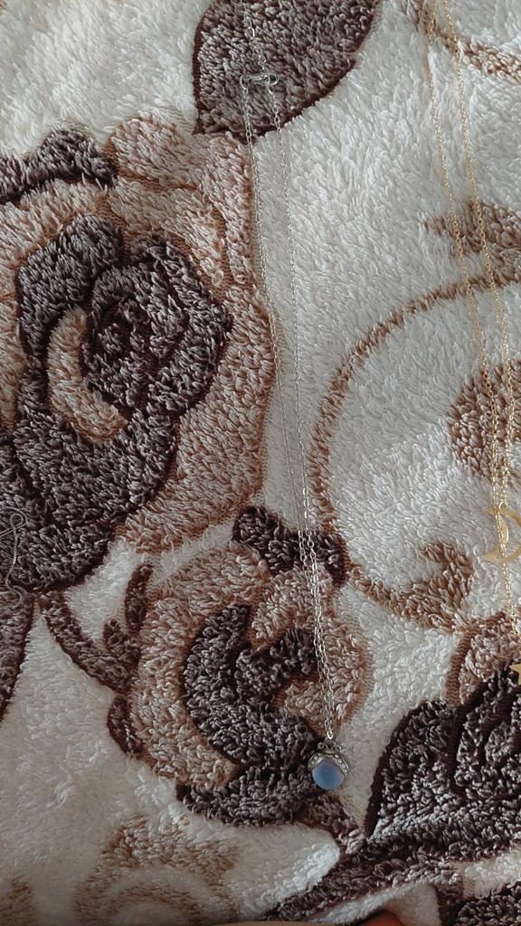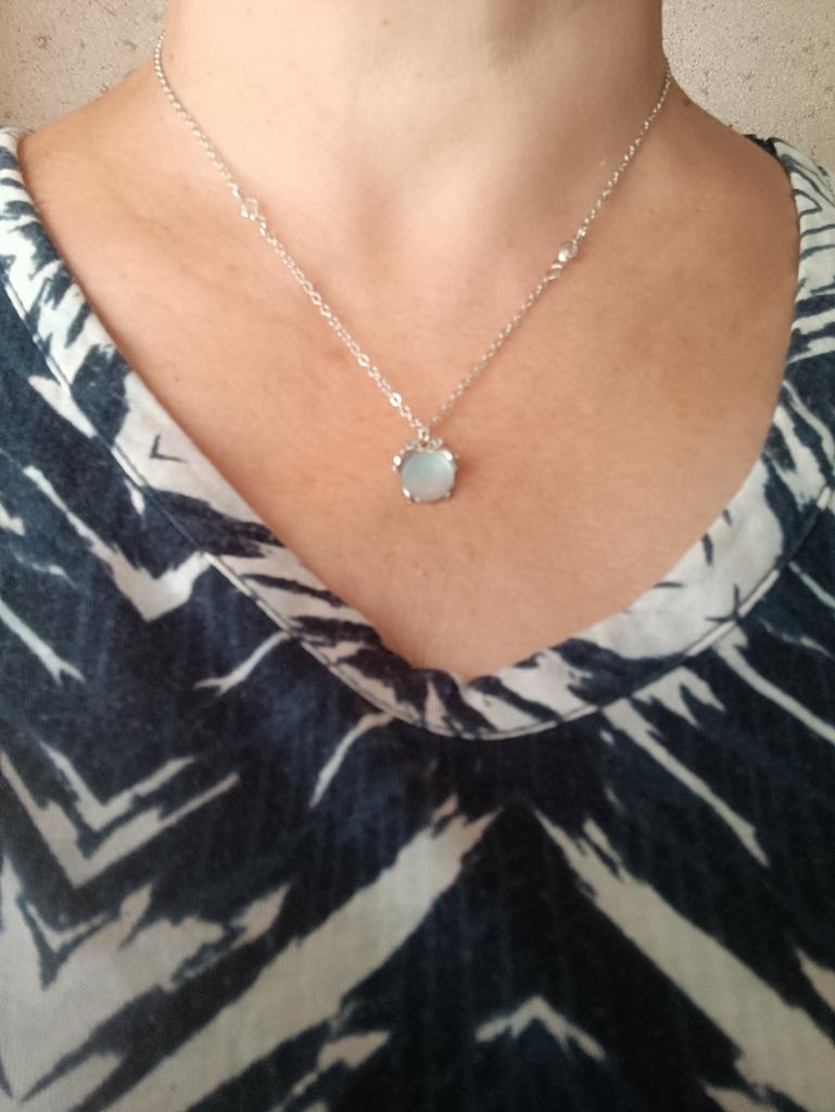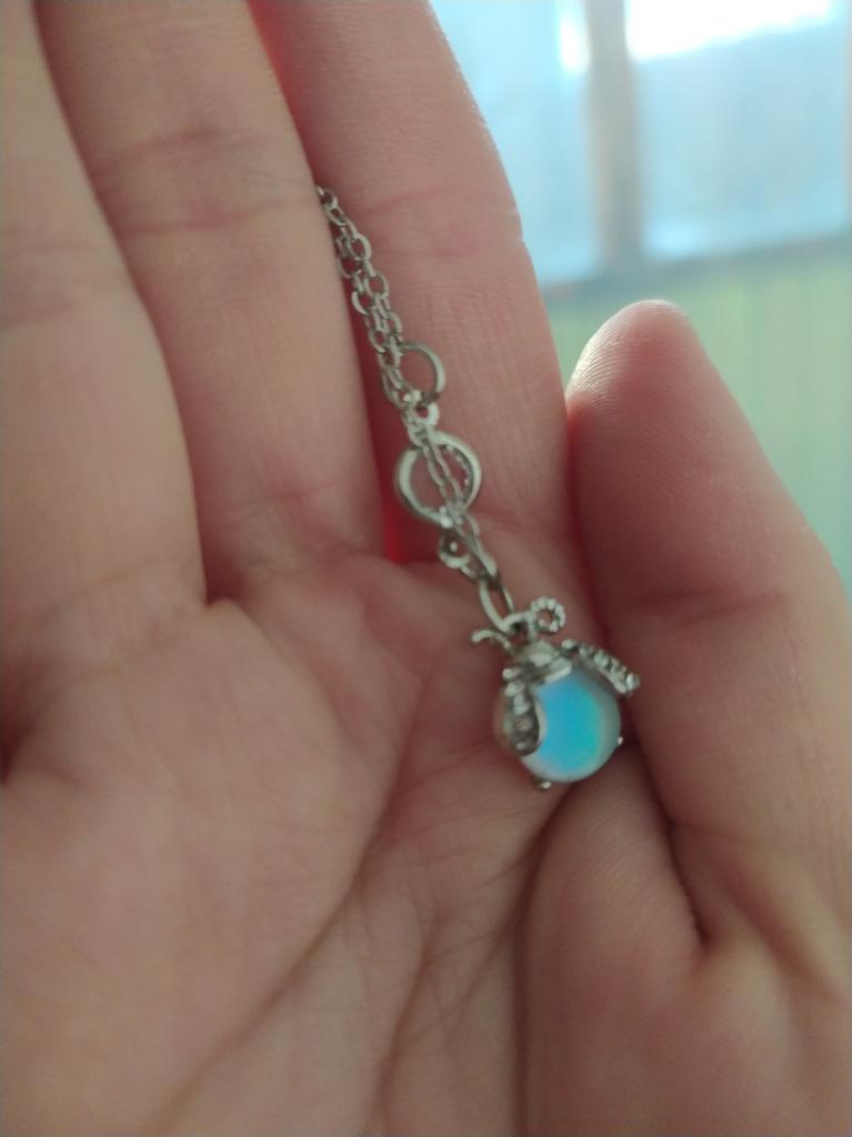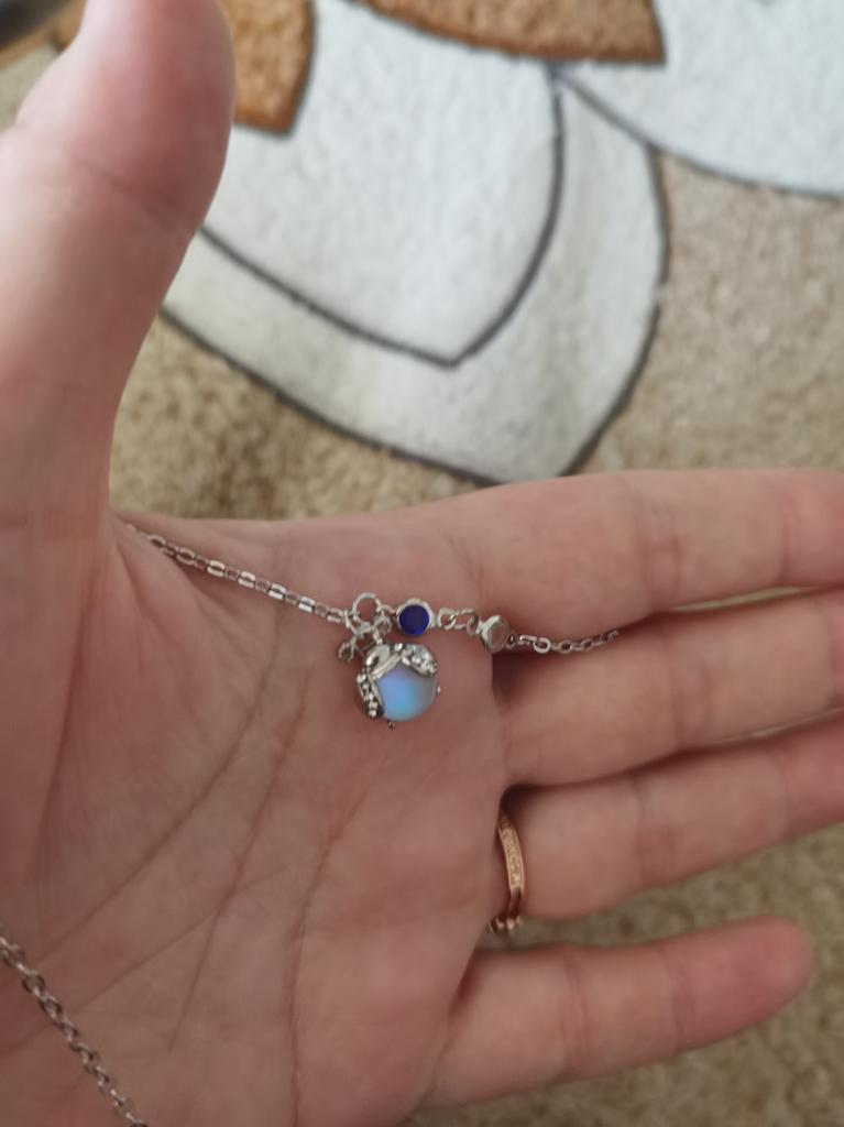 The pendant is very pretty, there is a blue stone on the chain which does not exist in the ad photo, I could have understood if there was one on each side but that is not the case. Impossible to change the chain if you want a longer or shorter one because the stones on the chain block the passage of the pendant.