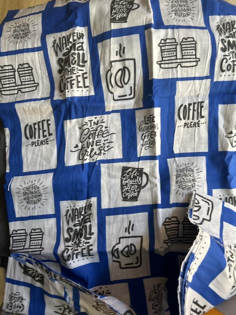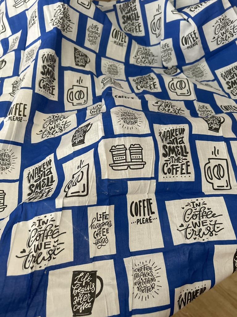 Soimoi Blue Japan Crepe Satin Fabric Coffee Please Text Print Fabric by Metre 42 Inch