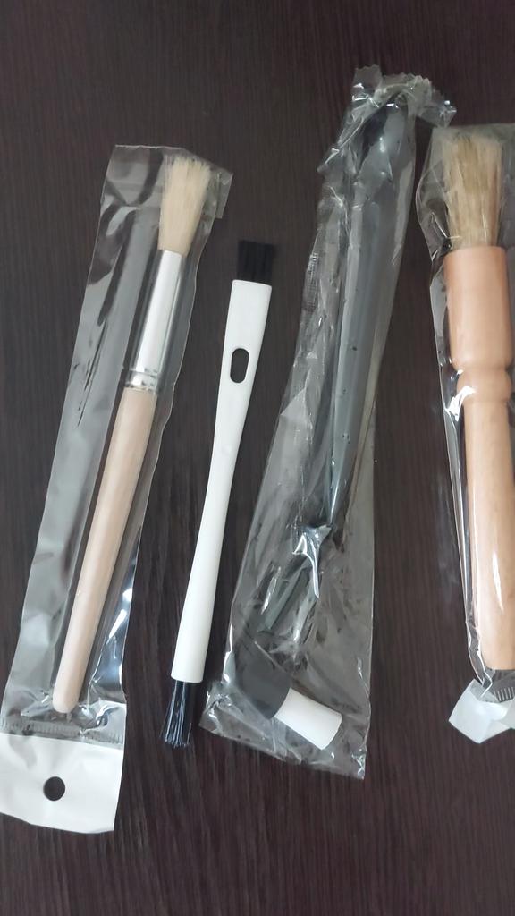 Excellent tools: There is a two-sided flat brush with plastic bristles, 2 round white bristle brushes, one of them comes with a small spoon and there are also 2 bristle brushes, one smaller than the other. I like them!