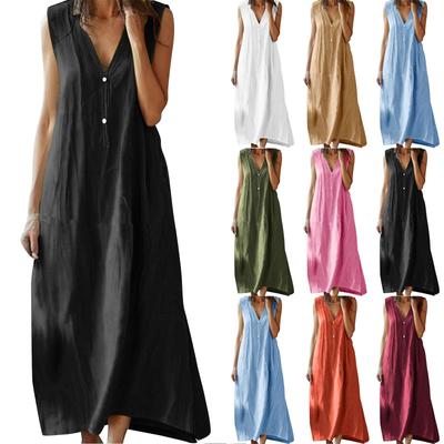 2022 New Solid Color Sleeveless Skirt Loose Cotton Linen Dress Insert Pockets Dress