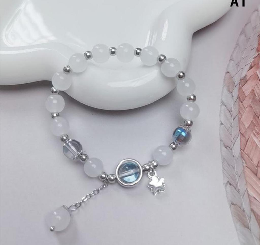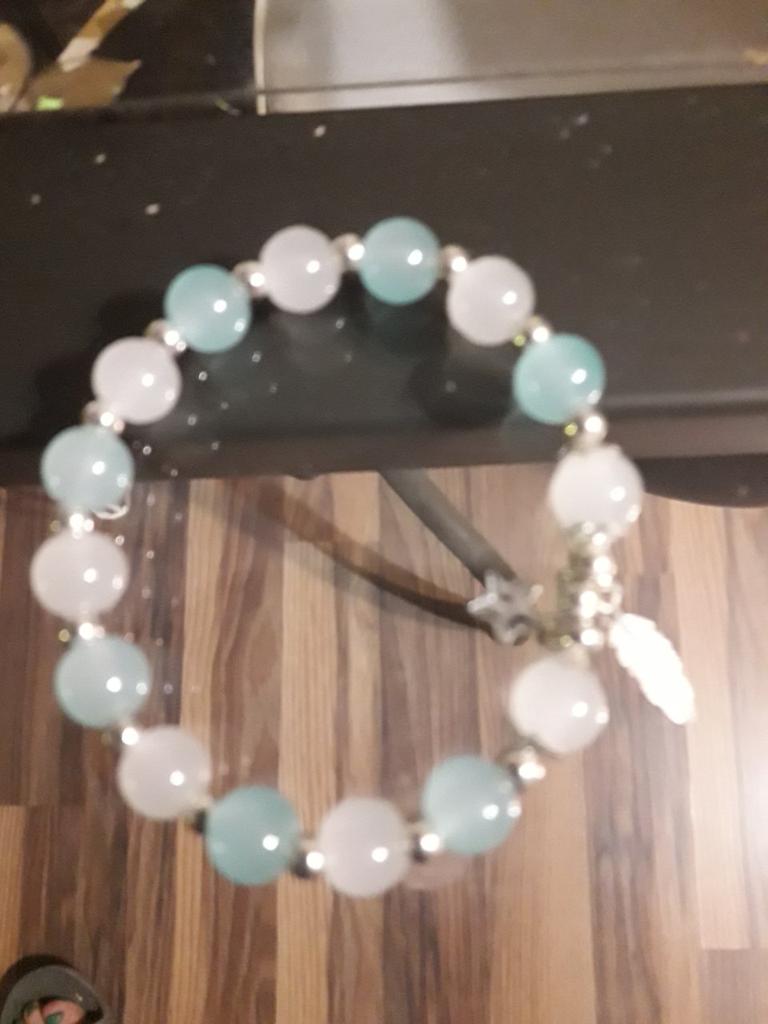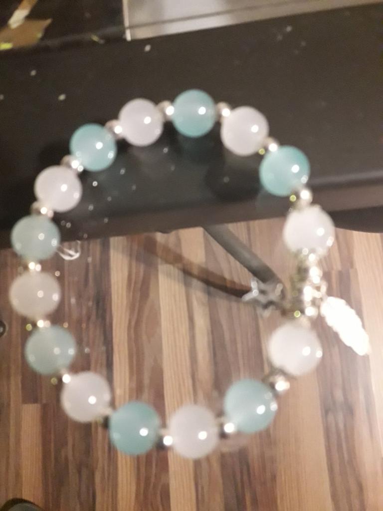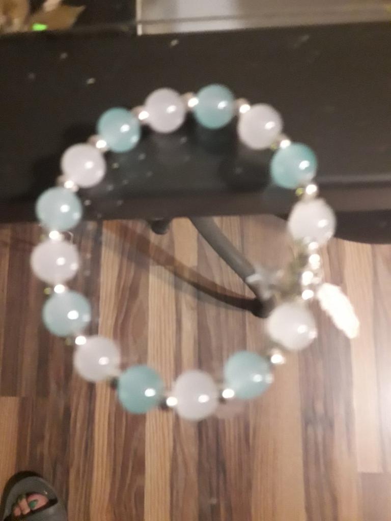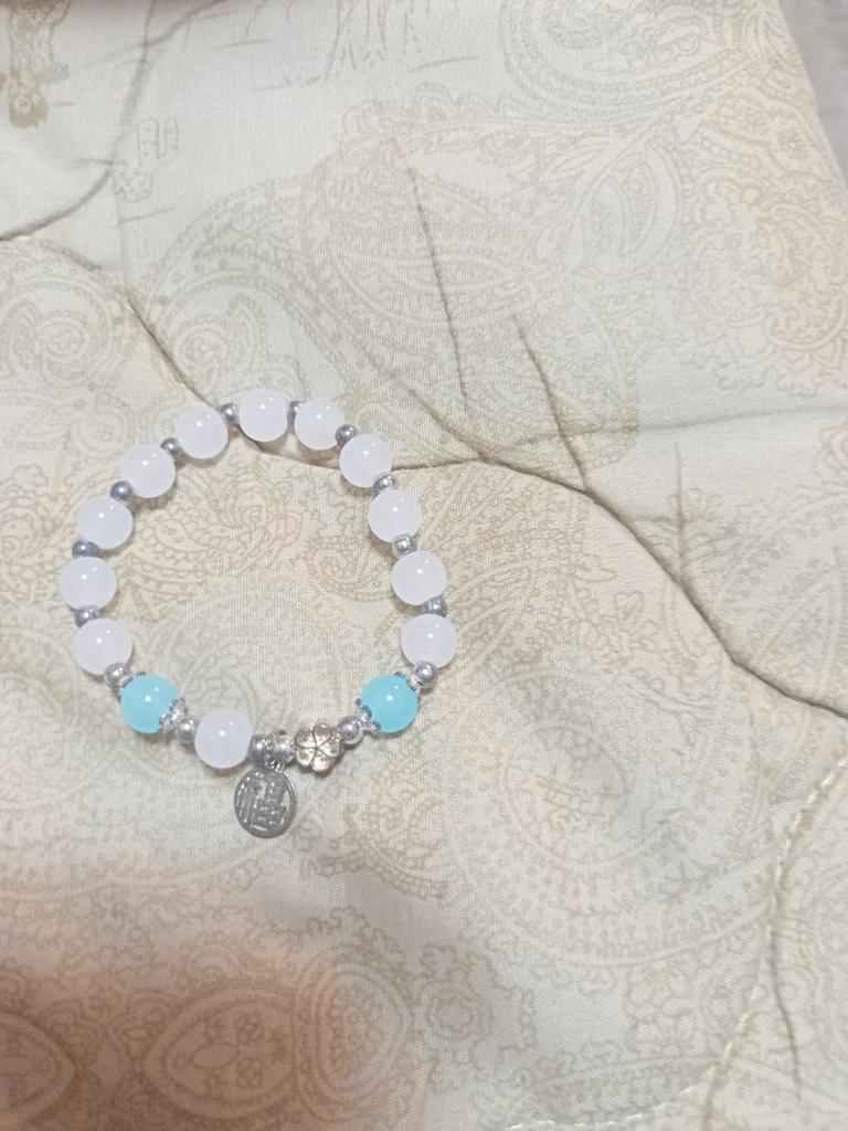 I think they mixed up the color, it's not blue at all, but a cloudy white color. The bracelet is okay, very beautiful, I like it like this too.