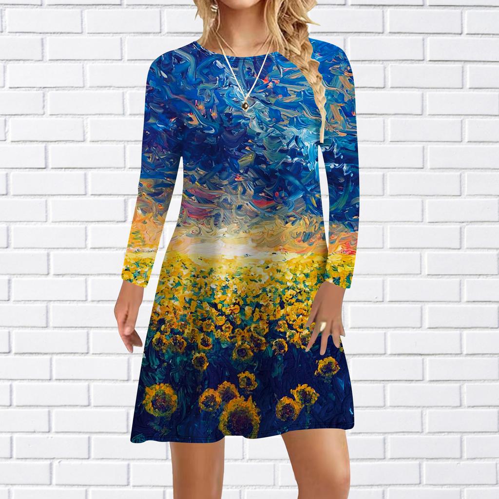 Women Casual Dress Autumn Blue Flower Sea Print Dresses For Women O-neck Short Sleeve Dress Plus Size