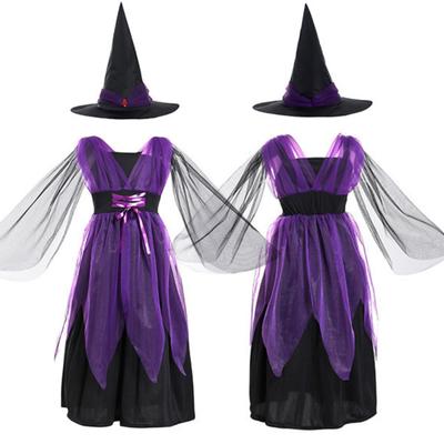 New Children's Witch Vampire Dress Mesh Dress Purple Green Dress with Hat Stage Performance Dress