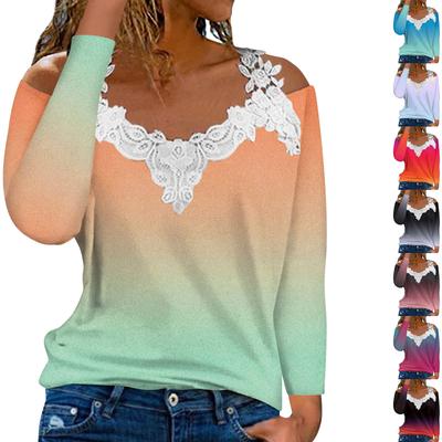 Fashionable Lace V-neck Pullover Long Sleeve Gradient Print Top Casual T-shirt