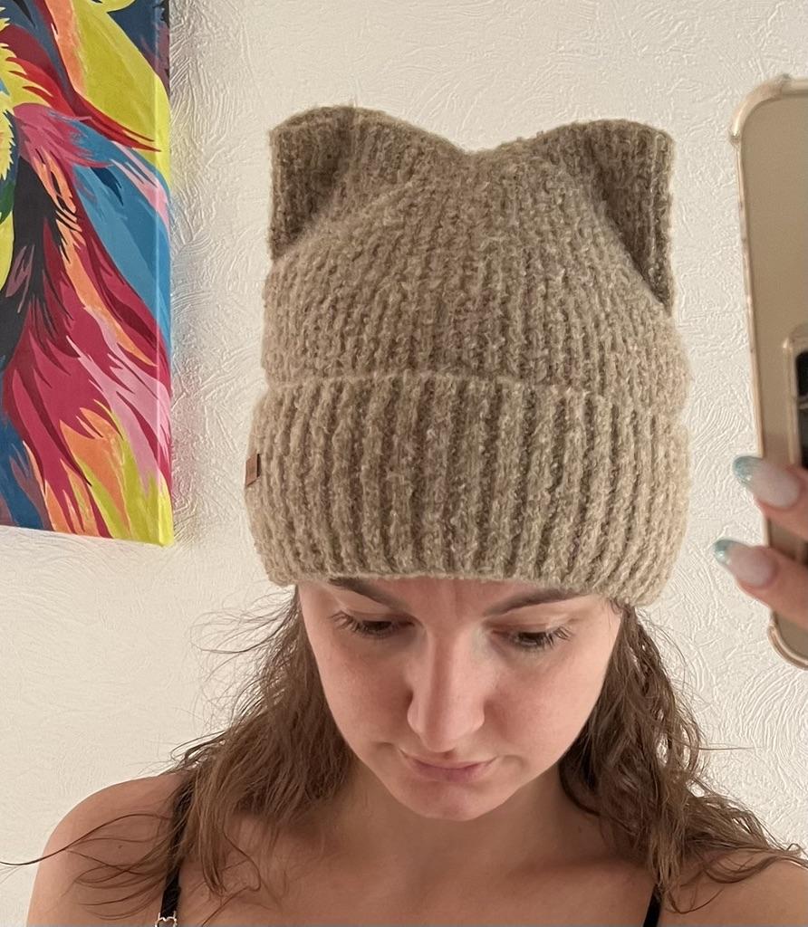 1pc Chic Leather Label Beanie Hat with Ears - Women's Knitted Accessories for Outdoor Travel - Thickened Warm Solid Color Daily Wear Hat for Winter