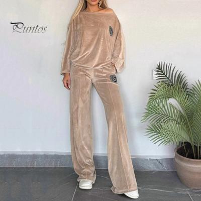 2 Pcs/Set Women Top Pants Suit Velvet Round Neck Bat Sleeves Blouse Wide Leg Solid Color Trousers Sport Casual Outfit Fall Spring Tracksuit