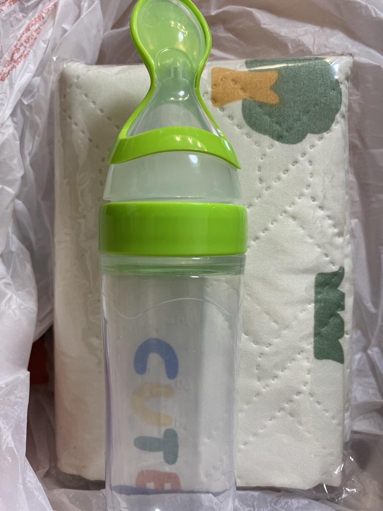 Good silicone baby feeding bottle. Large enough, soft, with markings to measure the dose, a spoon at the end to introduce to spoon feeding.
