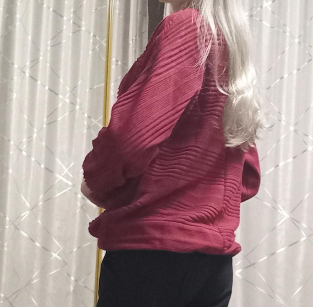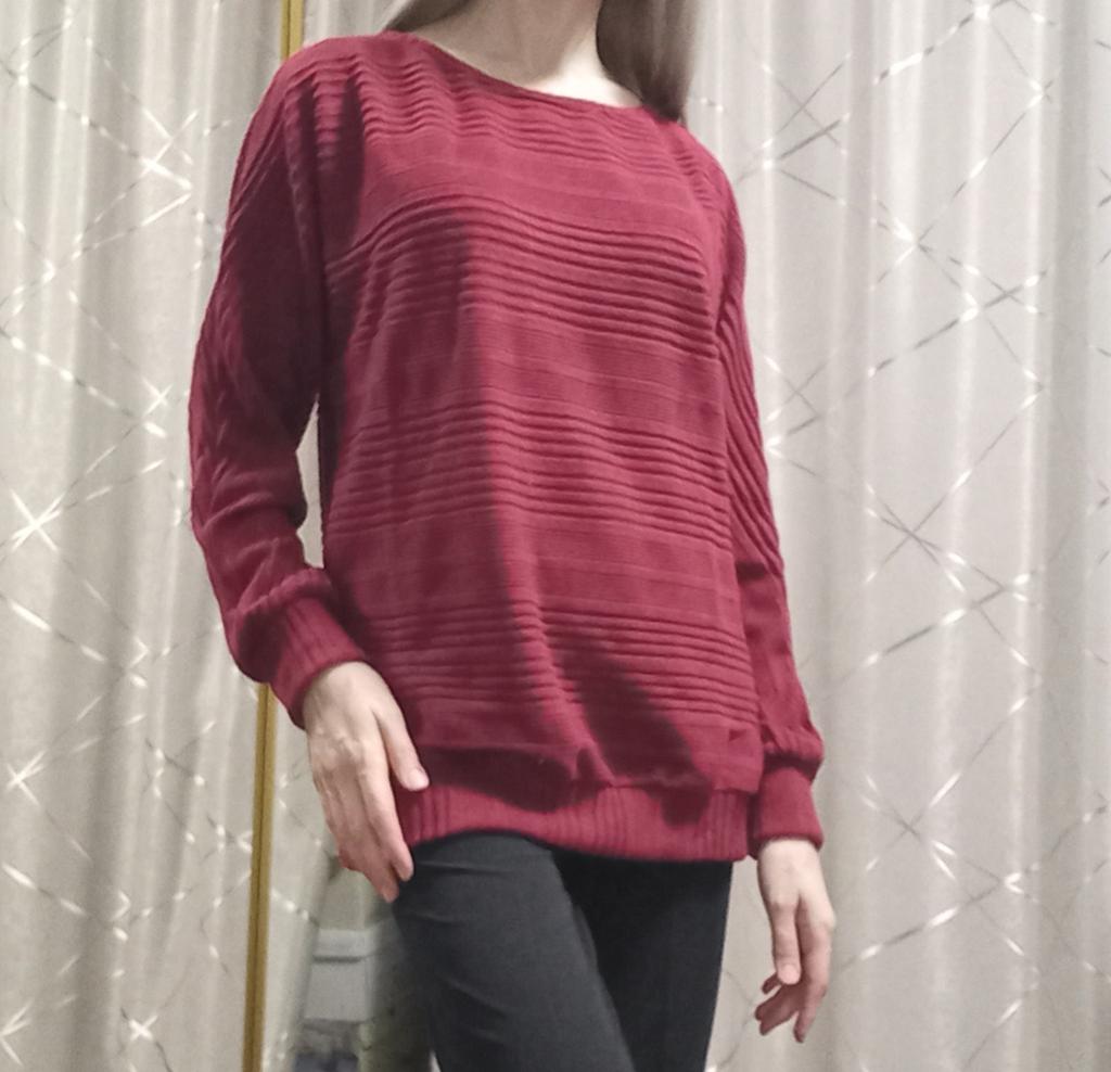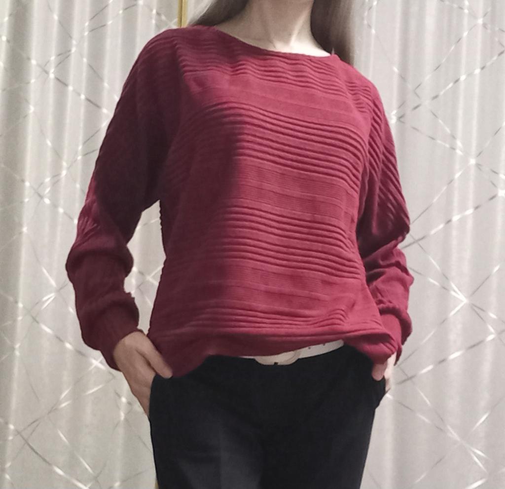 Good quality sweater, soft, size S for 90-70-90 is loose, but that depends on how you like to wear it. In my opinion, it's better to wear it tucked in.
