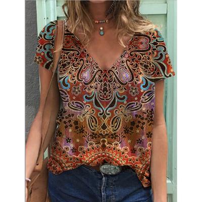 Ethnic Women's T-Shirt Vintage Graphics Fashion Short Sleeved V-Neck Regular Tops Daily Print Tee Summer Spring Casual Tops