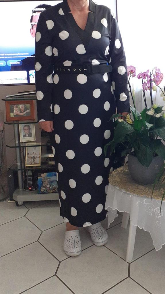 The dress looks beautiful and actually fits not too badly. The size XXXL was a bit too big and also long, but that can be changed. Better than too small π.