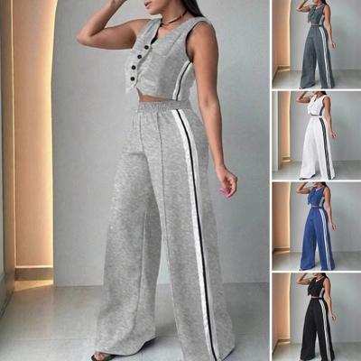 Women's 2 Piece Outfits V Neck Button Down Vest Top Wide Leg Pants Tracksuit