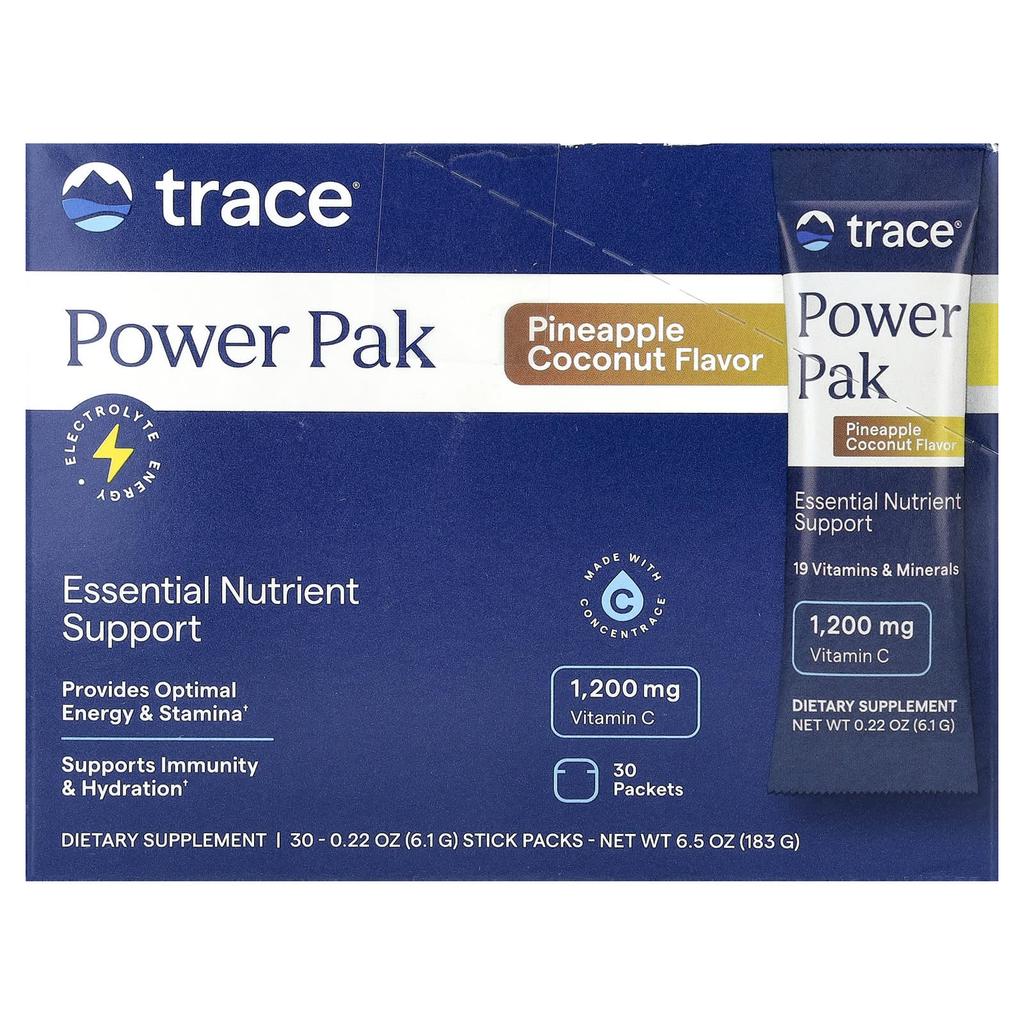 This Trace Mineral Power Pack contains industry-leading 1,200 mg of Vitamin C, along with essential electrolytes like B vitamins, sodium, potassium, magnesium, and calcium. It contains no artificial flavors, colors, or sweeteners. It also includes ConcenTrace®, a full-spectrum complex of ionic trace minerals, to help balance your minerals.