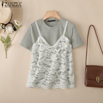 ZANZEA Women Casual Round Neck Lace Patchwork Summer Short Sleeve T-Shirt