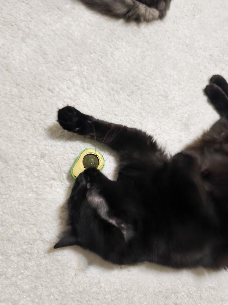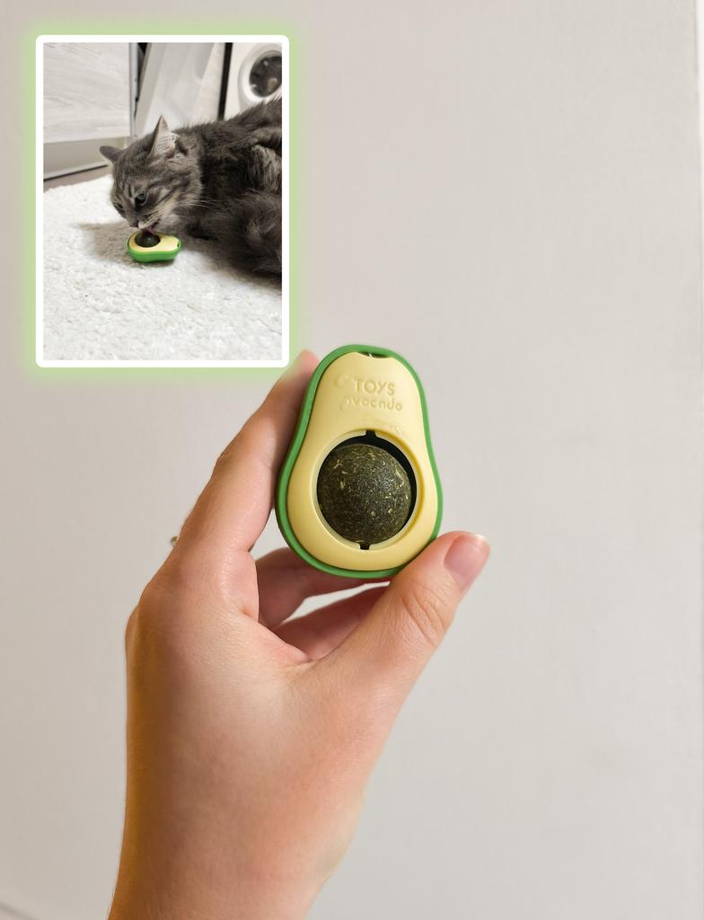 Ball with catnip in an interesting design The toy has an interesting design in the shape of an avocado, and inside there is a rotating ball with catnip.. The set includes double-sided tape with which you can attach the toy to any convenient smooth surface.. If you are looking for a way to please your pet, then this toy is the ideal solution.