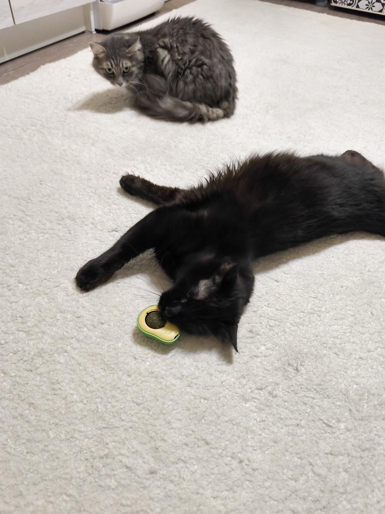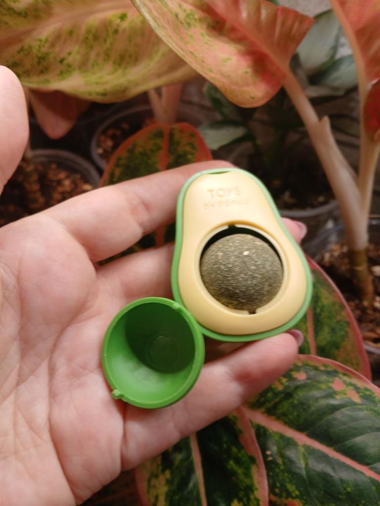 Ball with catnip in an interesting design 🥑 "Is this not for me?! Then don't leave it here! "🐶 (see video) Catnip is intended for cats, but it greatly interested my dog. He was constantly curious and the aroma was so tempting that he kept sticking his nose into the frame to sniff.. By the way, the aroma!!! of catnip can relieve anxiety and even improve mood in dogs. The quality is good, the mint is 100% fresh, this is both visible and noticeable. It is fragrant, has the correct herbal earthy-aromatic smell.. The toy is made well, and it comes with double-sided tape to attach it to the wall if necessary.. To keep the ball inside better, it is better to put it on the green lid and then secure it with the yellow panel (photo 8) I can recommend it 🤗