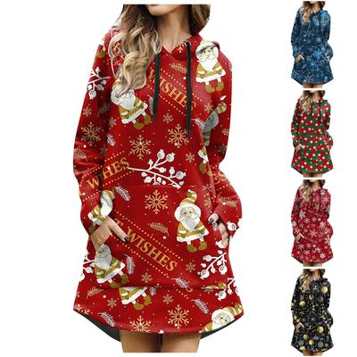 Ladies' Casual Christmas Printed Long Sleeved Pocket Hooded Sweatshirt Dress