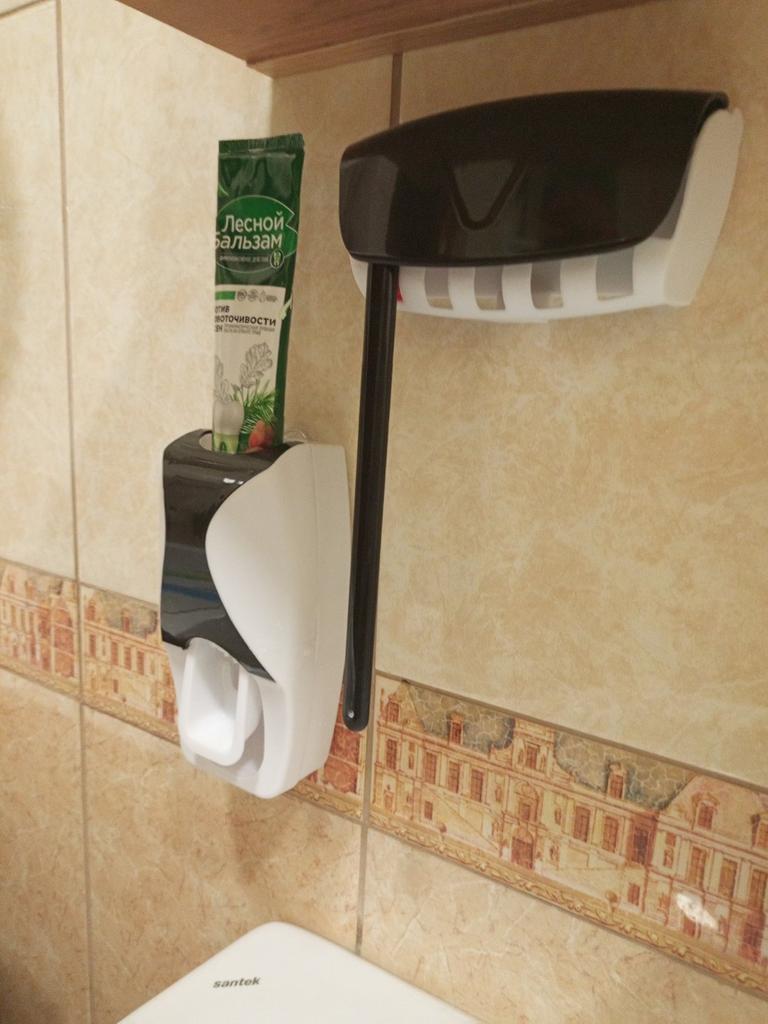 Automatic Toothpaste Dispenser with Brush Holder. The device is designed for economical and hygienic dispensing of toothpaste. It works without batteries; the toothbrush presses on the internal mechanism, which dispenses the paste. The holder is designed to store several toothbrushes in a suspended state, which promotes their drying and cleanliness.