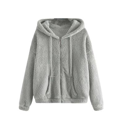 Women's Fashionable Coat Solid Color Long Sleeved Pocket Loose Hooded Zipper Plush Jacket