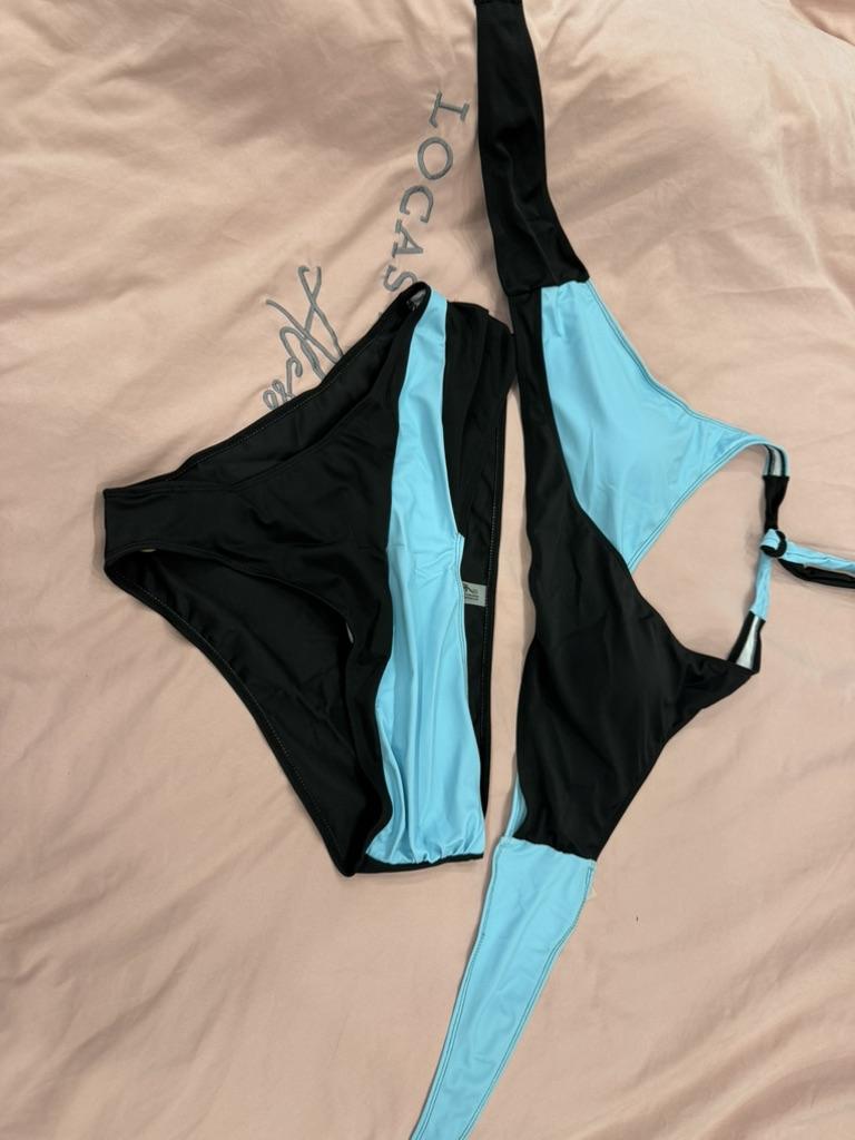 Color Block Criss Cross Backless 2 Piece Set Bikini, Halter Tie Neck Stretchy Swimsuits, Women's Swimwear & Clothing