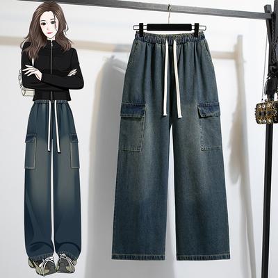 DIMANAF 2025 Autumn Plus Size Women Jeans Long Pants Basic Trousers Loose Wide Leg Pants Casual Solid Blue Large Size
