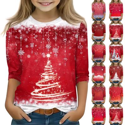 Christmas Day Print Tops For Youth Girls 4-11 Years Round Neck 3/4 Sleeves T-Shirts Trendy Tops Outfit Tees