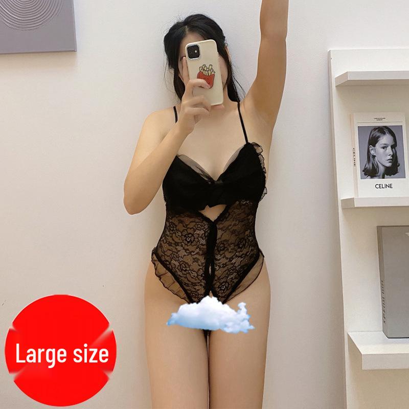 Plus Size Sheer Lace Bodysuit with Open Crotch and Suspenders - Sexy Nightwear Temptation.