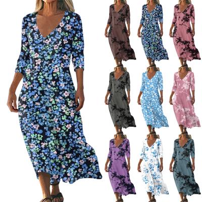 Women's Casual Comfortable Floral Print Three Quarter Sleeves Cotton Pocket Dress