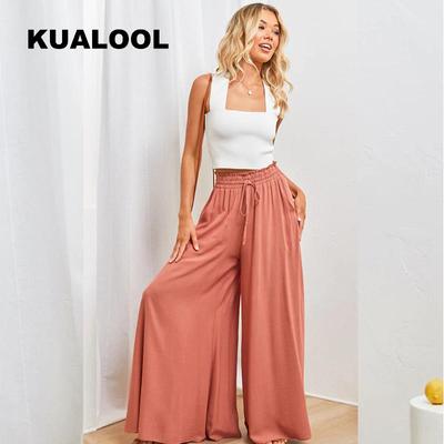 Women Casual Pants Elastic Drawstring High Waist Wide Leg Long Trousers Solid Color