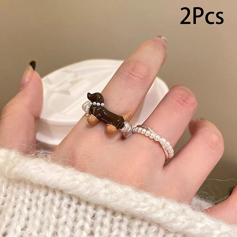 2Pcs Cartoon Sausage Dog Ring Cute Creative Rings Simple Pearl Ring For Women Girls Fashion Ring Jewelry Accessories Gifts