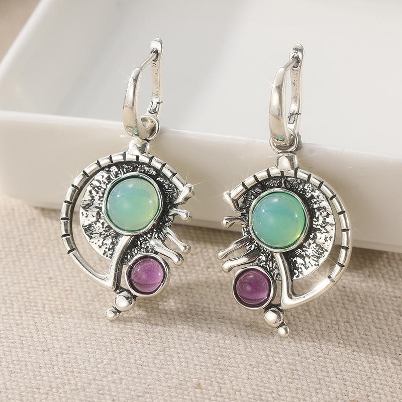 Bohemian Vintage Synthetic Emerald Asymmetrical Pendant Earrings Women Exquisite Banquet Dangle Earrings Jewelry Crafts