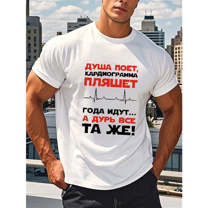 European Sizes Men's Russian Text Print T-Shirt - White with Cyrillic Design, Relaxed Fit Short Sleeve Shirt