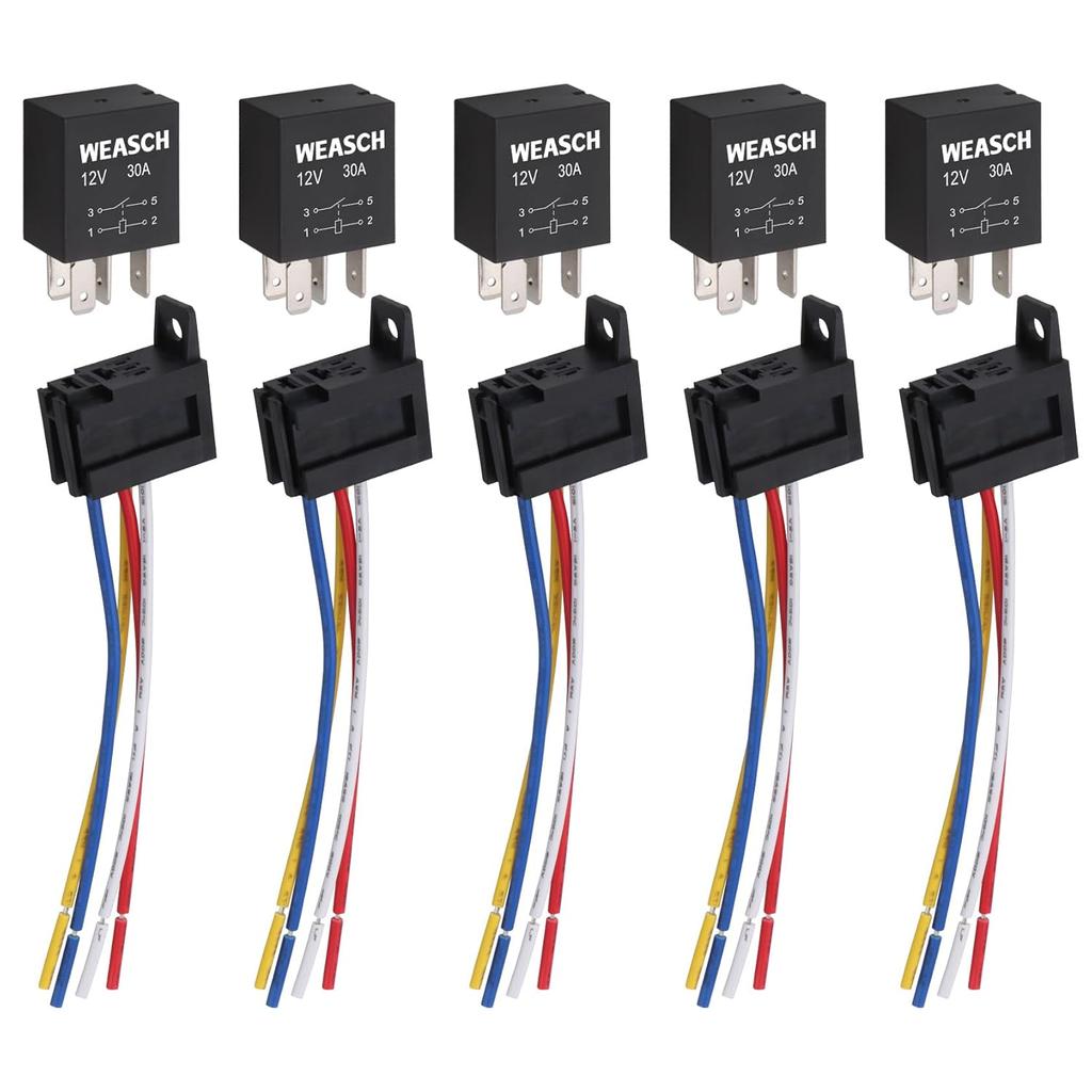 5 Pack Heavy Duty Standard Relay, 12V 30A, SPST 4Pin, with Wire Socket Plug Harness, Multi-Purpose Replacement Automotive Relay (5)